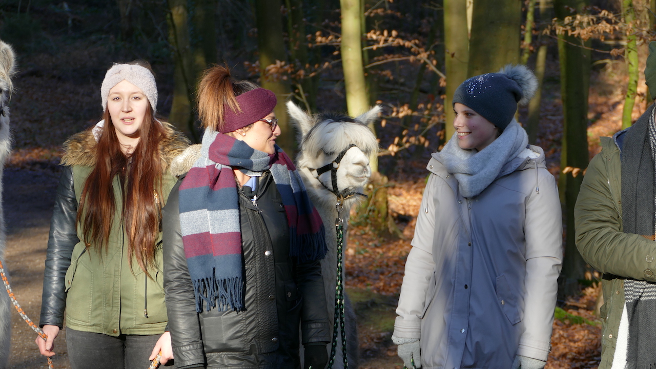 Auch dieses Mal wurde den Kursteilnehmer/innen ein Alpaka-Lamaspaziergang durch den Aachener Wald angeboten. Alpakas sind ruhige, freundliche, sensible und eher distanzierte Tiere. Sie verhalten sich sehr vorsichtig und ein respektvoller, einfühlsamer Umgang mit ihnen ist unbedingt erforderlich und wird geübt. Gemeinsam mit den Tieren vom Schellartshof unter Anleitung von Frau Doum ging es langsamen und achtsamen Schrittes durch den Wald.
